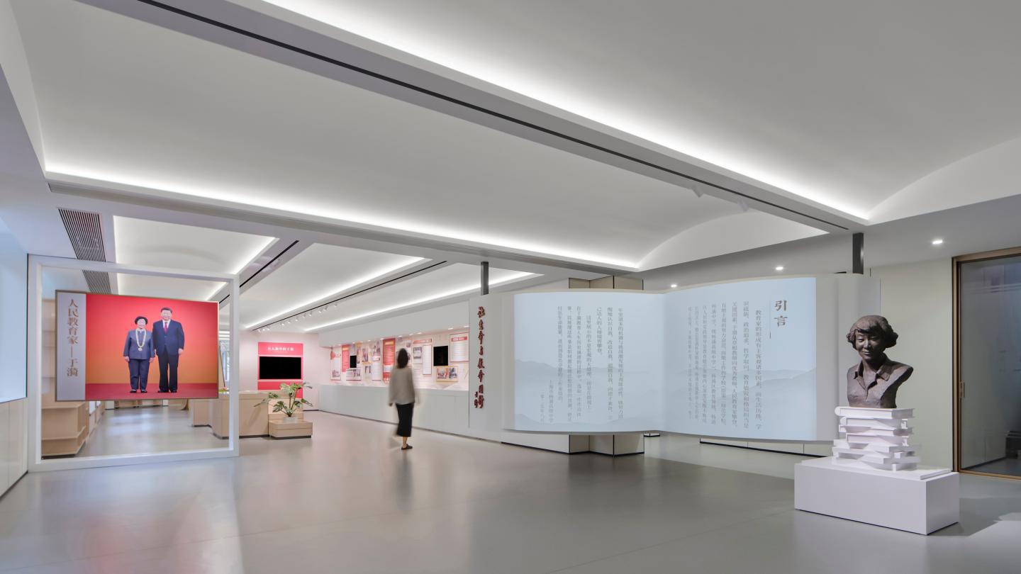 In terms of spatial organization, the design cleverly utilizes the existing structural grid of columns as a natural framework and rhythmic guide, creating a clear and harmonious sequence. The visitor route is thoughtfully divided into five sections: Entrance Lobby (Introduction to Yu Yi) → Teaching Philosophy Zone (Understanding Her Thoughts) → Educational Achievements Zone (Witnessing Her Accomplishments) → Personal Character Zone (Appreciating Her Character) → Yu Yi Classroom Experience Zone (Stepping into Her Classroom). This journey forms a progressive experience—moving from cognition and resonance to emotional elevation—and constructs a complete and profound narrative of educational inspiration.