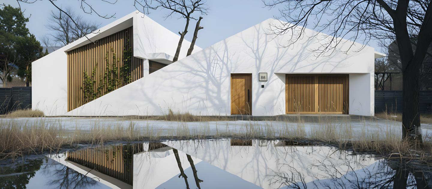The production idea comes from exploiting basic geometry, creating visual movement through intersecting white designs. The large line plays the role of dividing the game space, while creating a clear rhythmic structure for the overall process. The adjacent wall block plays a key role, bringing a sense of purity and modernity. The wooden slat system at the main door and garage area both plays the role of a sun ceiling and creates a warm highlight. The slat slots are arranged with climbing green patches, helping the project harmonize with nature and increase aesthetic depth. The natural reflection of tree shadows on the wall surface creates a soft visual effect, creating a position for the surface.