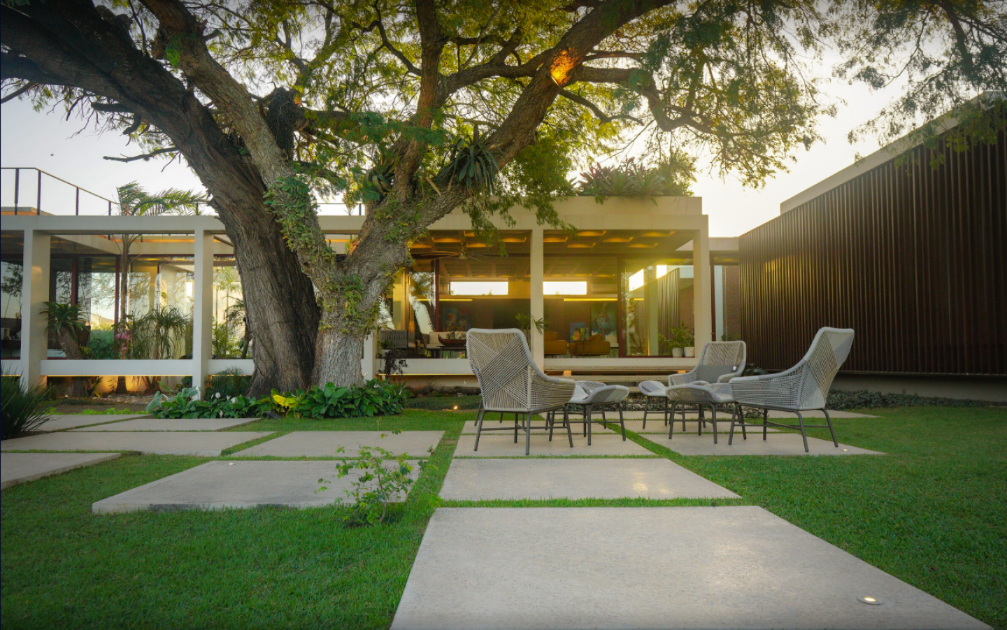 The extension features a flat roof, creating a living area that captures the breathtaking views of the surrounding landscape. Protected from the sun by the 40-meter-diameter canopy of the cupesí tree, this space becomes a haven for contemplation and enjoyment. These passive climate control measures keep the house cool without artificial cooling and guarantee abundant, glare-free natural light.