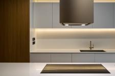 The renovation embraces this spirit, preserving the discreet charm of the past while reshaping the house into a warm, contemporary retreat. Natural stone and expansive openings remain central, but they are now paired with refined interiors that speak to modern living. A continuous wooden structure flows through the rooms, integrating furniture, cabinets, and hidden doors into a seamless design. Every detail, from wardrobes to a liquor cabinet, disappears into the rhythm of the woodwork, creating a calm and cohesive atmosphere.