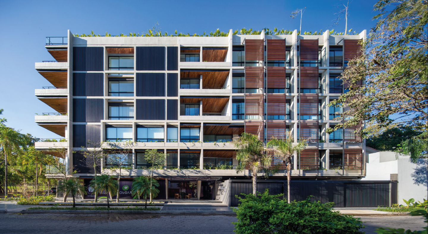 The design features prominent slab lines, accompanied by linear planters interrupted by concrete ribs, which, along with the greenery, frame and create a rhythmic, irregular character on the facade. These ribs run vertically through the building, creating a new, prominent presence within the environment, completely devoid of any pre-conceived design language.
