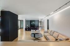 Inside, white dominates. It is not a sterile white, but a luminous one—an atmosphere of clarity and openness. Against this backdrop, black elements punctuate the space with sculptural presence. The marble fireplace, the mobile TV furniture, and other custom pieces act as dividers, articulating zones within the open-plan layout.