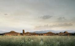 The floor plan layout translates the rhythm of weaving into spatial composition. The main block is divided into four separate volumes, creating open forecourts and arrival halls that prevent circulation overlap and maintain clear spatial flow. This division lightens the overall mass, allowing the architecture to blend with the village scale instead of dominating it.