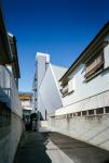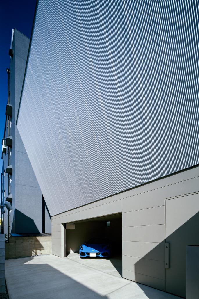 Considering the car access route, visibility from the narrow road, rain exposure, and second-floor daylighting, we developed a design with a slightly slanted, cantilevered wall on the second floor, creating a gap to let in light and air.