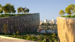 The project redefines the relationship between culture, nature and urban life, transforming a neglected area into a dynamic park dedicated to art and culture. The buildings rise as sculptural extensions of the terrain, clad in stone reminiscent of the mountains of Montenegro, while their accessible green roofs return the occupied land to the public, offering elevated terraces and panoramic views of the river. What the architecture takes from the ground, it gives back as landscape: a symbolic act of reciprocity and care.