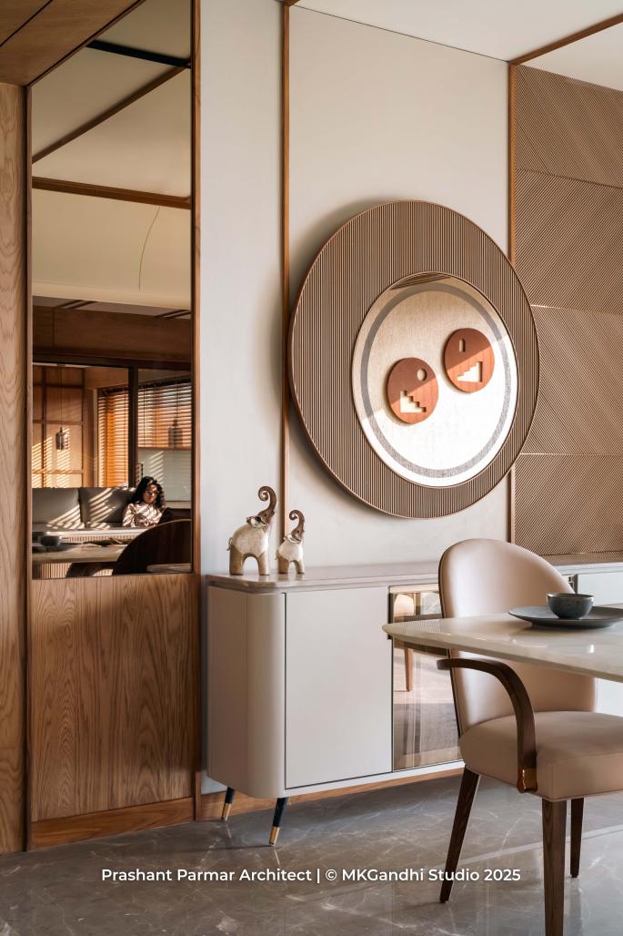 The design intention behind Riverside Elegance was to create a home that feels calm, timeless, and intrinsically connected to its riverfront setting. With the apartment opening to three sides, natural light, breeze, and expansive views of the Sabarmati became the foundation of the design approach. The aim was not just to frame the outdoors but to let nature shape the mood, flow, and warmth of the interiors.