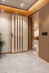 Stonelam-clad main door, telescopic glass sliding partitions, fluted glass accents
