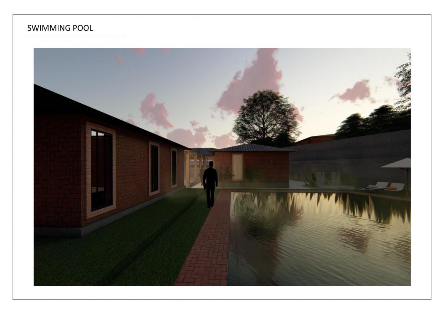 The wellness blocks, representing the lungs, nerves, and internal systems of the body, are connected to nature through soft thresholds: shaded verandahs, courtyards, colonnades, and semi-open platforms. Each zone is intentionally designed with varied proportions, acoustic qualities, and light patterns to influence mood and sensory response. The yoga hall opens to long east-facing views, creating a slow, expansive breath at dawn. Therapy rooms are more intimate, dim, and tactile, allowing the body to shift inward. The swimming pool, set slightly above ground level, reflects the sky and hills, becoming a space for both physical and emotional buoyancy.