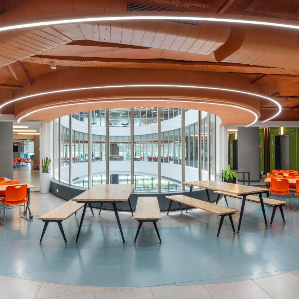 An eight-storey central atrium drops daylight deep into the plan; its radius is picked up in custom curved gypsum forms and pendant lighting rings, lending every level a subtle sense of spin and anchoring the community spaces around the void.