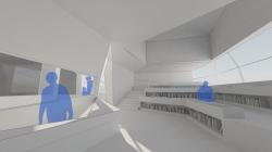 Shaped like a carved rock, the building symbolizes human effort and the transformative power of knowledge. Public spaces—an exhibition area, café, lecture hall, and multipurpose room—are placed on the ground floor for accessibility. A glass atrium anchors the design, connecting the library’s two main zones and allowing sunlight to flood the reception through visible bridging pathways.