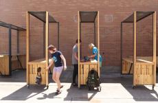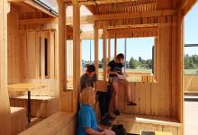 The primary structure of the covered lunch area is constructed from discarded lumber that