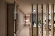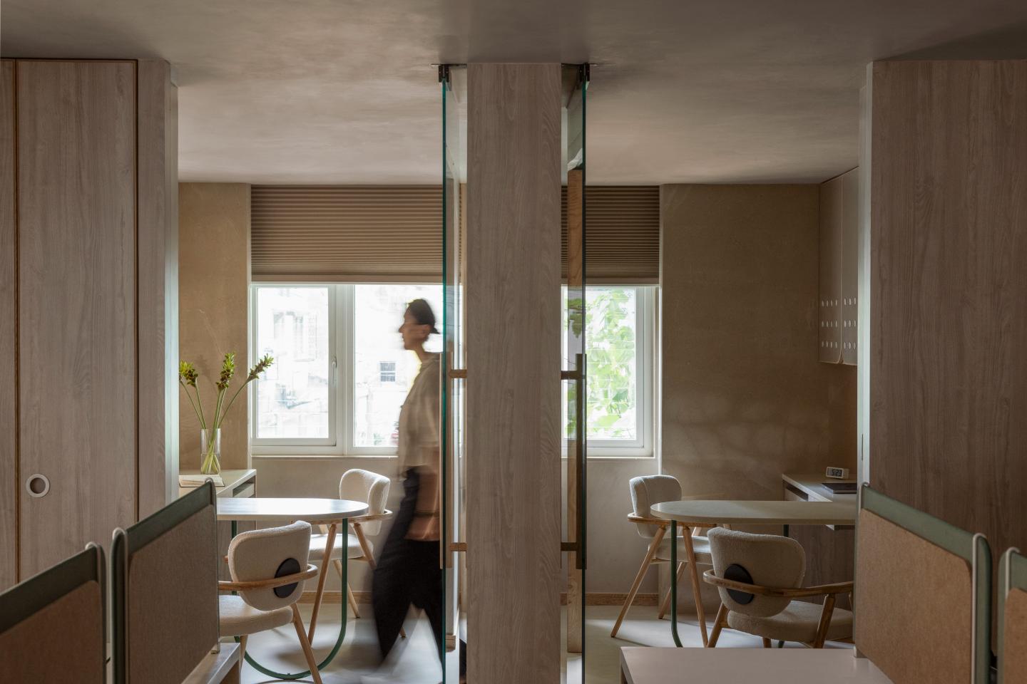 The existing building, with its low ceilings and small windows, was retrofitted with seamless ceilings and custom-coloured profile task lights. To create the illusion of larger, modern windows, the dwarfed ones were framed with marble side panels. Additionally, the leaf veins were echoed in the spatial layout, mimicking the interconnectedness and support within the office. The design focused on bringing natural elements into the urban office environment. Natural light was introduced wherever possible, complemented by green tones and leaf patterns to create a refreshing, calming atmosphere.