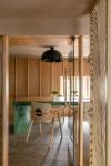 Ascending to the first-floor workspace, the leaf motif becomes more prominent, evolving into dividers and accent elements. The open-plan workspace maintains a cohesive, calming atmosphere with green tones and leaf motifs. The landing foyer serves as an anchor point, connecting private meeting rooms, a lounge, a puja area, and workspaces on either side. Customized abstract leaf ceramics, designed by Keph Design specifically for Leafline, adorn bespoke shelves in the foyer.
