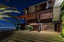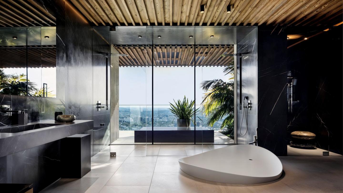 • Floor-to-ceiling glass walls frame unobstructed views of the Los Angeles skyline and Pacific Ocean, allowing natural light to flood the interiors.