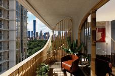 Warm stone and matt bronze dialogue with terrace greenery, their tactile surfaces complementing curved light sanctuaries. Balconies articulate harp-like rhythms, their graduated louvres softening metropolitan sightlines. Floating banquettes and planter ledges intertwine organically, framed by champagne gold aluminium edging delineating artful functionality. Dual entrances orchestrate distinct experiences: The North Entrance evokes luxury boutiques through a pipe-organ-inspired lobby; the South Entrance merges with the city park via natural stone pathways and cascading foliage. Soaring glazed walls invite multi-dimensional light, crafting habitats of refined serenity.