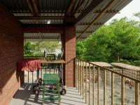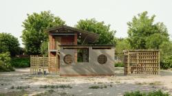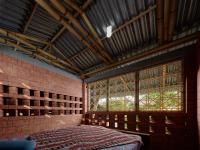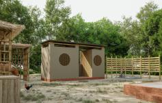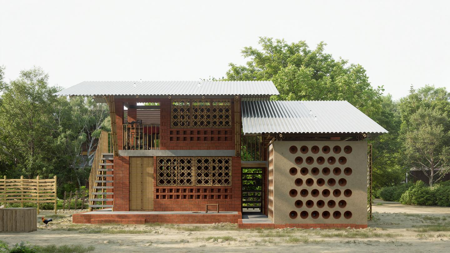 The $2,500 Vernacular Home is a sustainable house designed in Para Dash, the bamboo village of Modonpur, Bangladesh. Built with a budget under $2,500, including labor and materials, it uses only local resources: mud, straw, bamboo, bricks, and tin sheets. The home accommodates a family of four, consisting of parents and their son and his wife. To address Bangladesh's hot climate and long monsoon season, the design uses a raised veranda, steeply pitched roofs for rain runoff, and a layout that ensures every room catches the breeze. Varying window heights on windward and leeward sides enhance ventilation. Clay pots from a nearby village are embedded in the tea house façade to cool the air through airflow compression. The house includes two bedrooms, a kitchen, a toilet, cow sheds, and a future child's room. A weaving area for the daughter-in-law sits on the upper-level balcony, allowing her to stay connected to the family while working. The parents' tea house and shop are placed along the village road for accessibility and courtyard privacy. Due to limited electricity, 'liter bottles of light' are used on the roof to brighten interiors. Rooted in local knowledge, the design reflects true vernacular sustainability.
