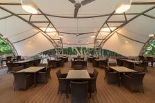 A 12-foot-wide tensile-roofed corridor connects the deck to the main clubhouse, serving as both a transitional walkway and a designated smoking zone. This addition reinforces the project's cohesive spatial flow.