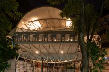 Opting for an ellipsoid form wasn’t merely an aesthetic choice—it was a strategic response to space optimization and site context. The gently curved geometry allows the structure to integrate fluidly with the surrounding landscape, framing uninterrupted views of the trees and establishing a strong architectural identity. Structurally, the ellipsoidal trusses—arranged in a cruciform layout—enable efficient load distribution, minimizing the number of vertical supports.