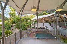 A blend of steel and tensile fabric was chosen for its lightweight and speed of construction. The project had to be completed in just four months to align with the club’s operational needs. With existing service lines and a pool directly below, steel was the clear solution—enabling long spans with minimal disruption to the site.