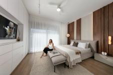 The couple’s private bedroom was designed as a quiet retreat. The bed’s headboard wall was custom-crafted in dark wood veneer, with subtle embossing, natural stone accents, and hidden lighting that creates a calming atmosphere. On each side of the bed—non-symmetrical natural marble light fixtures, an unconventional choice that adds personality and uniqueness.