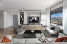 The heart of the new home is the living room—an open, bright, and inviting public space, designed in an elegant, luxurious, and warm style. A striking slatted carpentry wall combines open and closed niches, hidden lighting, and a champagne-gold-toned stone backing, creating a sense of softness, depth, and presence.
