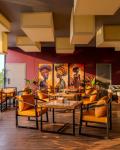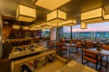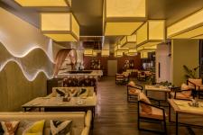 Situated just 20 minutes from the city center, the sprawling 10,000 sq. ft. property harmonizes effortlessly with its environment. A breezy outdoor deck sets the stage, lined with natural stone flooring, cane and rattan seating, and lush greenery. Overhead on the live kitchen is a thatched roof that enhances the earthy aesthetic, while three sides open up to breathtaking views of the hills and skyline. At the heart of this space is a live kitchen, cleverly crafted to resemble a stone cave. Its windows tease patrons with glimpses of culinary theatrics, releasing tantalizing aromas into the open air.