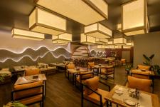 The outdoor area transitions seamlessly into an indoor lounge through a floor-to-ceiling glass facade, merging the two spaces in a continuous visual loop. Inside, the ambiance shifts to plush sophistication. A captivating ceiling installation of wooden boxes and fabric panels takes center stage, casting a warm glow after dusk. This interplay of light and reflection creates a mesmerizing effect, amplified by the dark night sky visible through the glass panes. Beyond the lounge lies an expansive lawn, perfect for open-air celebrations and large gatherings. The 2,000 sq. ft. indoor space balances vibrant energy with a cozy warmth, making it equally suited for intimate family dinners and spirited evenings with friends. Together, the zones create a dynamic yet cohesive experience that caters to a wide spectrum of patrons.