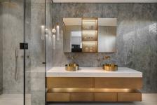 In the primary bedroom, a boutique hotel-style suite was created: a bed surrounded by soft, pleasant carpentry, a library for fashion and design items, a vitrine facing the view, and a bathroom that blends warmth with quiet romance, in mocha tones and natural stone. Even here, a piece of the couple's plate collection is embedded — a reminder that intimacy lives in every detail.
