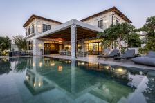 The structure is built in an L-shape, opening toward a private garden and a carefully designed swimming pool. This layout allows for maximum privacy while offering open views of the surrounding greenery. The combination of large openings, natural materials such as stone and wood, and exceptionally high ceilings creates a spacious, bright, and pleasant living experience.