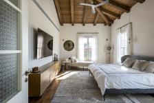 The living and dining areas open to the garden and feature a decorative fireplace, carefully selected textiles, and contemporary art. All furnishings were planned and sourced from OKNIN Gallery, renowned for manufacturing custom-made furniture of the highest quality. The upper level is highlighted by a double-height space that connects the home's two wings via an exposed wooden bridge. The master suite includes a spacious walk-in closet with glass doors, a central island for storage and display, and a hidden passage leading to a luxurious en-suite bathroom with a freestanding bathtub, double shower, and cladding of natural stone and wood.