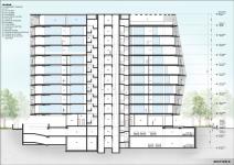 The planning strategy positions services and the circulation core along the southern edge to buffer heat gain and enhance environmental performance. By locating structural columns along the perimeter, the design achieves flexible, column-free floor plates that allow varied office configurations over time. Smaller office units are organized on the lower levels for accessibility, while larger workspaces are placed on the upper floors to maximize openness, daylight, and spatial efficiency.