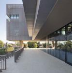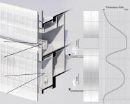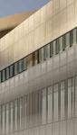 One of the most prominent architectural elements of the building is its parametrically designed facade developed through coding. The front facade forms an interactive, 120-meter-long band parallel to the main road and oriented toward the sea, allowing visual communication between the dynamic interior and the urban exterior. It simultaneously functions as an environmental filter. The perforation densities and levels of transparency in the aluminum mesh panels are defined according to interior programmatic needs: up to 72% openness and a horizontal slit for visual comfort and daylight access in office areas, and 40% transparency in the foyer for balanced daylight and solar control. These values were determined through parametric optimization based on energy performance, daylight distribution, and thermal comfort targets. The varying permeability ratios are designed on a hexagonal grid composed of circular perforations, creating a graduated and visually soft transition along the facade. The movement of sunlight contributes to this parametrically diverse surface, producing varying shadows, reflections, brightness, and color tones throughout the day.