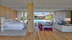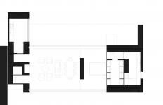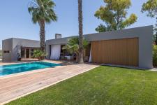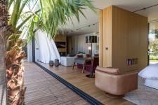 At its core lies a flexible living space where interior and exterior merge seamlessly. Window frames disappear into the walls, allowing the central room to operate as a covered void, open to the pool on one side and to a private garden on the other. This space, accommodating living, dining, and sleeping functions, is conceived not as a conventional room but as an adaptable field—defined by its porosity and its capacity to shift with the rhythms of daily life.