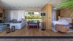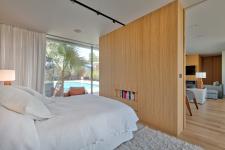 Privacy is treated as a dynamic condition. The northern façade shields the interior from external views, while the southern edge opens generously to nature. Full height curtains can enclose the space in a soft, introspective cocoon, and sliding wooden panels allow the bedroom to be separated without compromising the overall spatial flow. These elements enable the Pool House to oscillate effortlessly between openness and retreat, sociability and solitude.