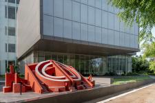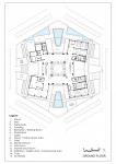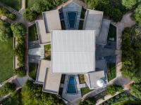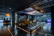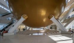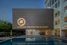 The Gallery is organized into five distinct blocks: a three-storey central atrium enclosed within a transparent glazing system, surrounded by four peripheral blocks. This configuration forms a powerful architectural metaphor for the Solar System, with the four surrounding blocks subdivided into pairs to symbolise the eight planets orbiting around the Sun. Suspended dramatically within the atrium is a monumental 24-metre diameter brass-plated globe representing the sun, supported on peripheral steel structures and hovering above an amphitheater-style event space, serving as the spatial and experiential anchor for visitors. It houses the planetarium, which is accessed via a bridge at the upper level, reinforcing the perception of a celestial body suspended in space.