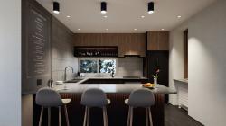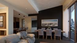 On the opposite side, similarly elevated windows and a slanted ceiling bathe the living–dining area in natural light while opening sweeping views toward the distant town and Mount Yotei, creating a welcoming environment for both relaxation and social gatherings. The open-concept kitchen – fully equipped and elegantly integrated – supports a seamless flow between cooking, dining, and entertaining. On the same level, the media room adds flexibility for movie nights, gaming, or quiet reading. A continuous and spacious balcony on the front façade connects the living space and the master bedroom to the outdoors, offering elevated perspectives and unobstructed views of Mount Yotei.