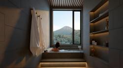 Positioned between the living spaces and the master suite, a traditional Japanese tiled bath completes the upper floor. Framed by natural textures and softly filtered light, the space is oriented toward a picture window that opens directly onto Mount Yotei. More than a functional amenity, it offers a quiet, meditative retreat—an intimate moment of restoration after a day spent on the slopes.