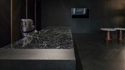 In the executive offices, vertical bronze blades create a taut contrast with the diagonal grain of the wood, while expressive marble veining draws the eye to the desk surfaces. Here, the tactile richness of the materials is balanced by the warmth of the furnishings, creating spaces that feel both composed and deeply human.