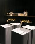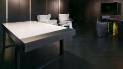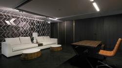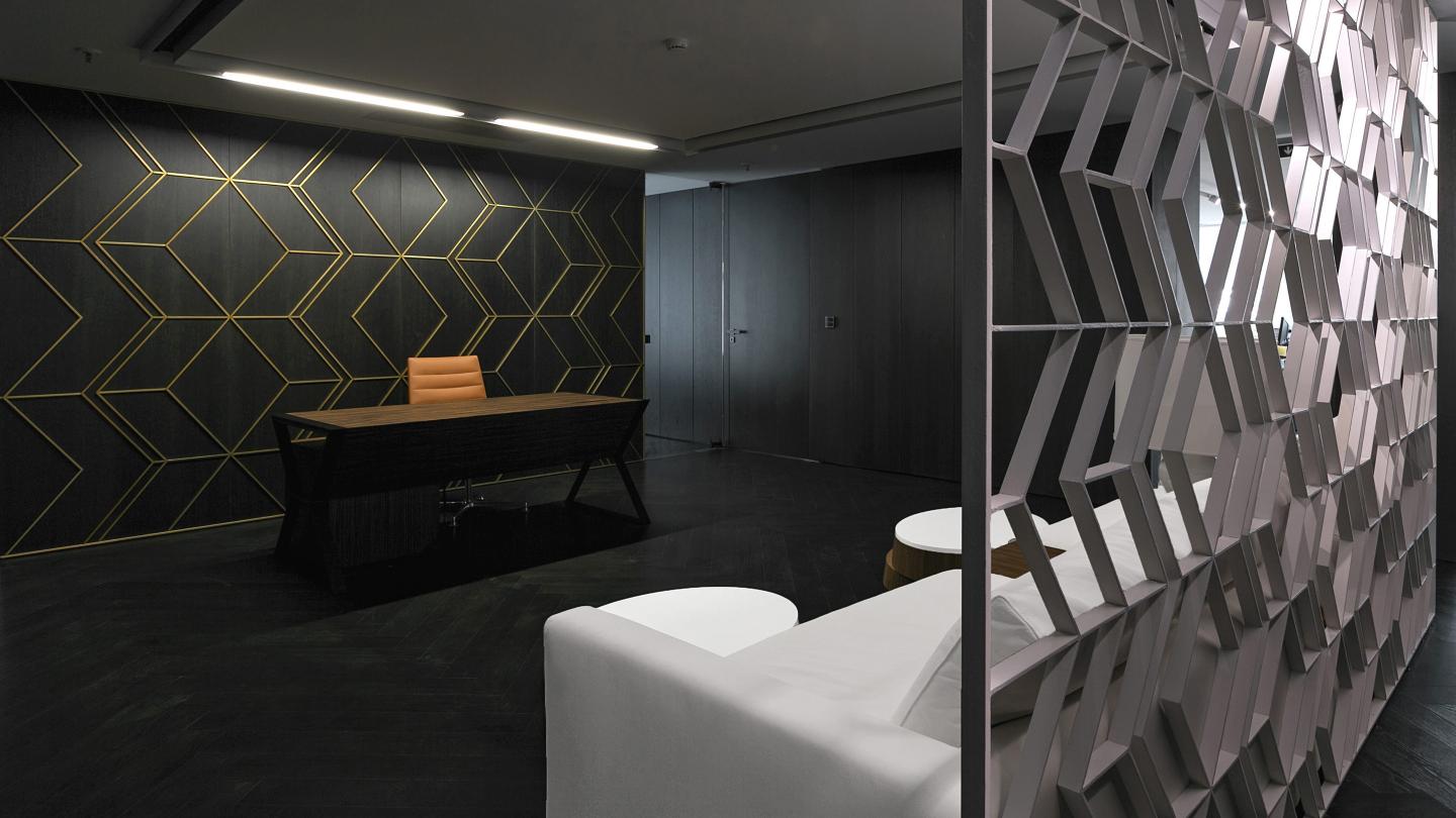 Elsewhere, the waiting room is envisioned as a compact, dark jewel — intimate, polished, and self-contained. A sculptural ebony desk, supported by delicate legs that quietly allude to the company logo, becomes the focal point of the space. This motif reappears in a bronze embossed pattern set against a wenge backdrop behind the desk, and again in a luminous white metal panel opposite, establishing a subtle visual continuity throughout the interior. The textured white sofa introduces softness and light, tempering the richness of the darker finishes.