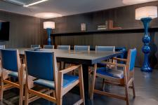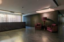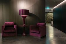Each room is shaped by its own distinct atmosphere. At the entrance, a generous reception desk is set against a bronze backdrop that filters light and lends the arrival sequence a subtle theatricality. Vivid armchairs in rich materials heighten the first impression, amplifying the space’s sense of presence. In the boardroom, the language of the herringbone floor is reinterpreted in the surface of the table, transforming a familiar motif into a monumental centerpiece.