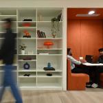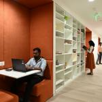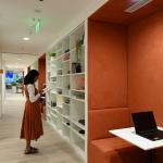 Critical functions are concentrated within a central core. The IT help desk and Network Operations Center anchor this zone, with a spine between the two zones conceived as a library corridor with seating and hydration points. The IT desk features a stretch fabric ceiling and cove-lit counter, positioned adjacent to the cafeteria to enable informal access.