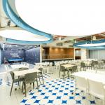 The café features corner seating configurations that maximise capacity and spatial intimacy. Overhead, a sculptural acoustic ceiling of stretched fabric forms a flowing ribbon-like composition, integrated with the company's values, vision statements, and key quotes. At night, the illuminated ceiling becomes visible from the building façade, transforming the interior into a glowing urban landmark. The same ribbon language is etched into muted grey flooring tiles, reinforcing a sense of spatial continuity.