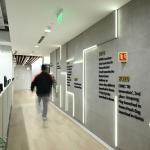 Corridors feature wooden LED-lit panels forming a history wall that chronicles the brand's complete journey. Surfaces combine concrete-textured finishes with light strips, while recessed panels create dimensional shifts across different programmatic zones. Throughout, collaboration zones are composed against muted bases, punctuated with saturated accent colours that immediately draw focus.