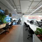 The idea of the delivery box served as a conceptual focus from the outset. This signature element of e-commerce logistics is expressed as a recurring motif throughout the office, woven into materiality, graphics, and spatial composition. The company's iconic rocket mascot, handcrafted in FRP and mounted on an illuminated podium beneath a stretch fabric ceiling, greets employees at arrival, standing before backlit lacquered glass displaying the brand’s vision statement. Adjacent to the reception, a touch-interactive screen enables real-time booking of agile seats and meeting rooms, enabling employees to navigate directly to reserved locations while doubling as a help desk access point.
