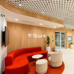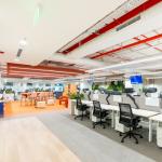 The floor plate divides into two distinct zones, each defined by its own colour scheme. The right wing features shades of orange, reflected in custom gradient carpets, while the left transitions features variations of blue. This colour-coded division strategically aligns with fire safety zoning, segregating the space into Fire Compartments 1 and 2. This segregation of spaces serves as intuitive wayfinding and lends the office a unique spatial character.