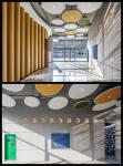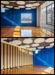 Suspended acoustic panels in the lobby and meditation center absorb sound while evoking a cosmic sky, inviting contemplation of the Buddhist principle of dependent origination.