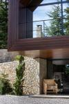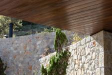 The stone base contains the public life of the dwelling at ground level, while supporting the more secluded part of the house: an independent guesthouse. Perched above like a periscope, this upper volume captures uninterrupted views over the treetops toward the dramatic forested mountain backdrop. The elongated stone plinth runs parallel to the site boundary and is carved out at one point to create a recess, within which the entrance is set.
