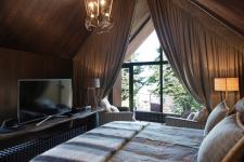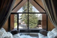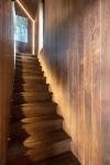 Hovering above the stone base and projecting beyond it in a surprising act of balance, the guesthouse reads as both shelter and lookout. Its interior is arranged in clearly defined zones. The timber roof forms a sheltered balcony, while a recessed glazed opening spans the full height and width of the sitting area façade, following the geometry of the pitched roof. A curtain, echoing the roofline, defines the private realm of the guesthouse and protects it from view. Beyond this soft threshold lie the bedroom and bathroom. Timber boards wrap the room in a continuous skin, cladding the façades, roof, internal walls, and ceiling alike, creating a seamless continuity between inside and out.