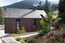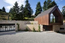 Conceived as a winter refuge in the Parnassian landscape, the house is composed through two archetypal forms: a grounded stone base and a pitched timber volume poised above it. Reading almost as a periscope, the upper guesthouse frames distant views across the forest canopy, transforming the act of dwelling into one of observation.