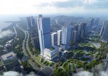To create a vibrant complex that seamlessly blends nature and energy, the design maximises the spatial planning within the constrained site. On the eastern plot, the office and hotel are vertically arranged to form a 230.05m super high-rise complex. The hotel rooms are designed on the upper levels, featuring panoramic sea views. The upper levels feature a 7.5m high, 360-degree sky lounge. The crown serves as ideal platforms for high-level business activities. A soaring sky atrium is positioned on the west, enclosed by a lightweight cable-supported curtain wall system. The convention centre and multi-function hall are stacked vertically on the north. The ground floor is elevated 12m, creating a welcoming urban plaza and grand entrance steps.